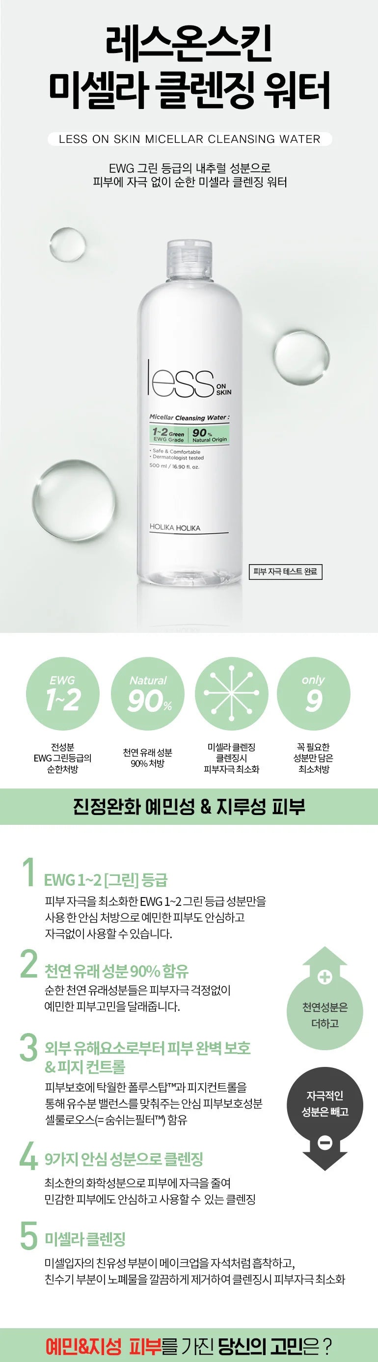 5. **Pour quel type de peau :** L'eau micellaire Less On Skin est formulée pour convenir à tous les types de peau. Elle participe au contrôle de la production de sébum, renforce la barrière cutanée, et sa composition EWG Green signifie qu'elle ne contient pas de substances nocives pour la peau.